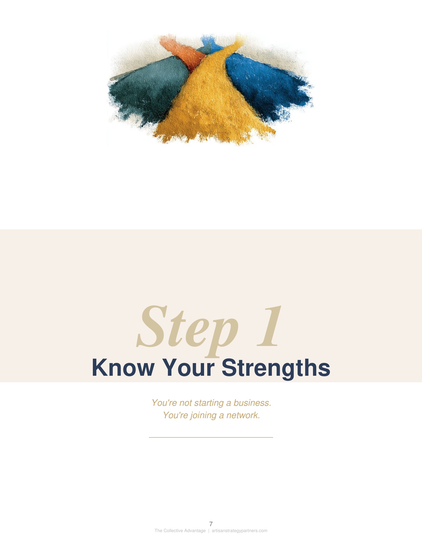 Not at all. The workbook starts with understanding your own strengths and builds from there. It’s designed for solopreneurs who are thinking about building a collective — whether you’re at day one or already partnering informally.
